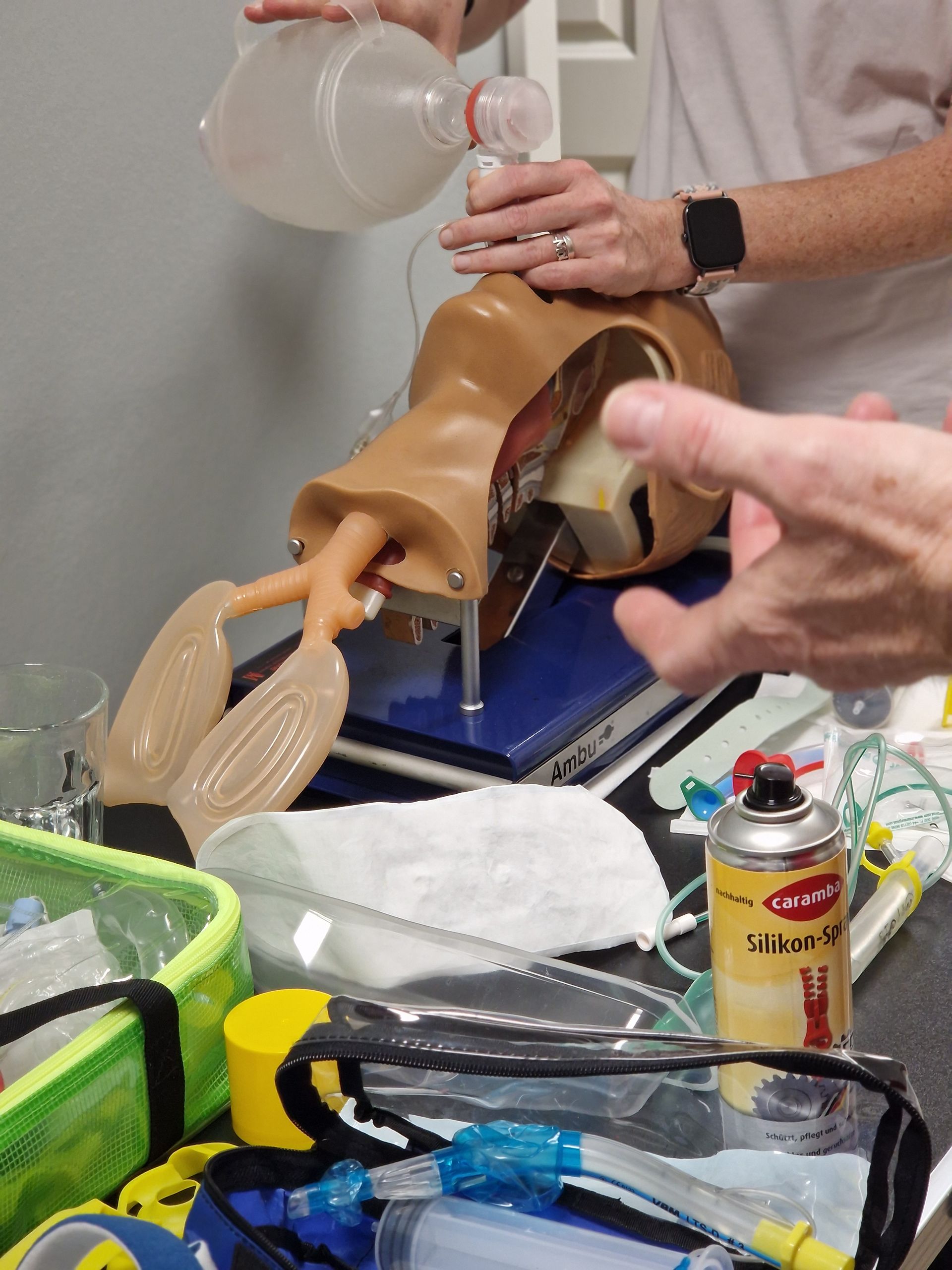 Sascha und Jürgen von IBS- Medzone haben ein Notfall- und Reanimationstraining mit uns absolviert. Wie gelingt ein sicherer i.v. Zugang im Notfall? Wie kann ich Beatmungsmasken einbringen? Welche gibt es denn überhaupt? Und wie transportiere ich einen Patienten sicher aus einem kleinen Zimmer raus, wenn dieser verkeilt in einer Ecke liegt und ich vor Ort nicht helfen kann? Und dann natürlich auch: Notfall in Raum 4! Wer setzt den Notruf ab? Wo finde ich den Defi und wann wird der eingesetzt? Wie ist denn überhaupt der Rhythmus bei einer Herz- Druck- Massage? Und wie muss ich das bei Säuglingen oder Kindern machen?